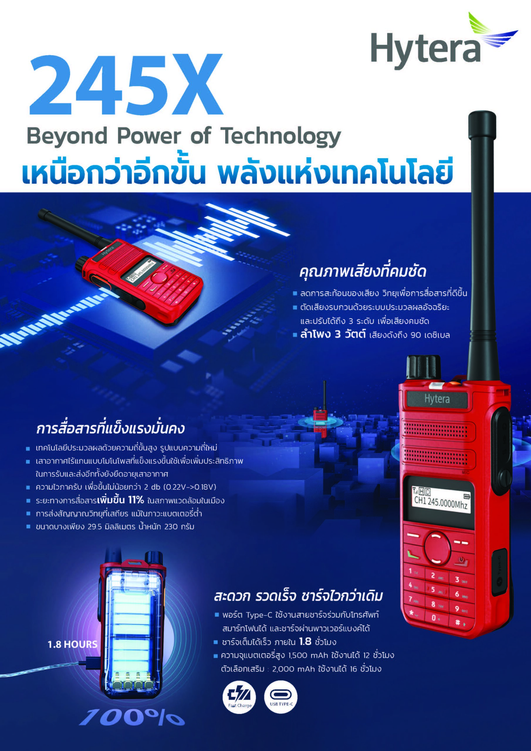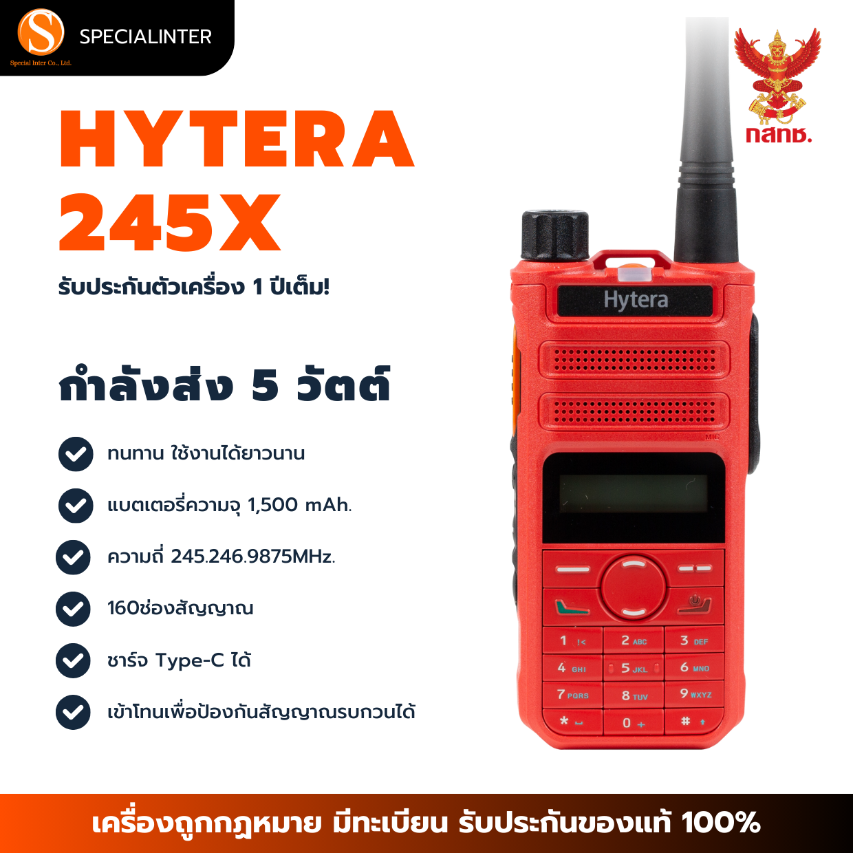 HYTERA 245X เป็นวิทยุสื่อสาร VHF แบบพกพาที่ออกแบบมาสำหรับประชาชนและกิจกรรมกลางแจ้ง เช่น งานอีเวนต์ เดินป่า หรือพื้นที่ที่สัญญาณโทรศัพท์ไม่ดี ตัวเครื่องมีกำลังส่งสูงสุด 5 วัตต์ ทำให้สื่อสารได้ไกลและเชื่อถือได้
