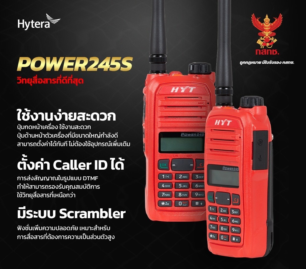 HYTERA POWER245S เป็นวิทยุสื่อสาร VHF แบบพกพาที่ออกแบบมาสำหรับการใช้งานประชาชนทั่วไปและกิจกรรมกลางแจ้ง เช่น งานอีเวนต์ เดินป่า หรือพื้นที่สัญญาณโทรศัพท์ไม่ดี ตัวเครื่องมีกำลังส่งสูงสุด 5 วัตต์ ทำให้สื่อสารได้ไกลและเชื่อถือได้