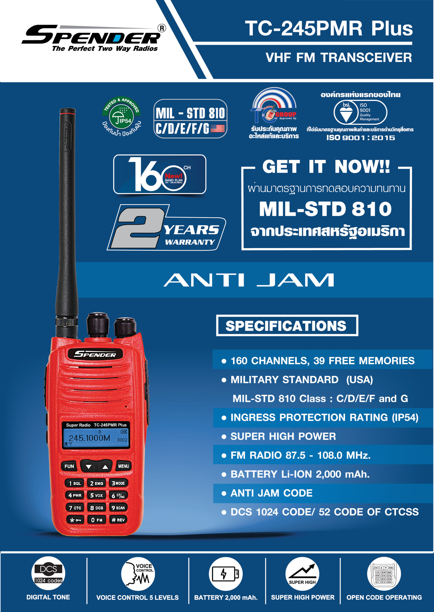 TC-245PMR Plus เป็นวิทยุสื่อสารที่ออกแบบดีไซน์ ให้มีกำลังส่งสูงและสามารถระบายความร้อนได้ดี และได้รับมาตรฐาน Ingress Protection Ratings(IP54) มาตรฐาน IP54 มีความสามารถที่จะป้องกันฝุ่นได้แต่อาจมีฝุ่นเล็กน้อยเล็ดลอดเข้าไปโดยฝุ่นที่เล็ดลอดเข้าไปนั้นต้องไม่มีผลใดๆต่อการทำงานของอุปกรณ์และมีความสามารถที่จะป้องกันละอองน้ำที่ตกกระทบตัวอุปกรณ์ได้จากทุกทิศทาง ทนต่อการตกกระแทกเพราะได้รับ ได้รับมาตรฐาน Military Standard (USA) MIL-STD 810 Class : C/D/E/F and G ทนต่อการสั่นสะเทือน การกระแทก หรือการตก มีระบบ ANTI JAM สามารถป้องกันการดักฟังได้100%
