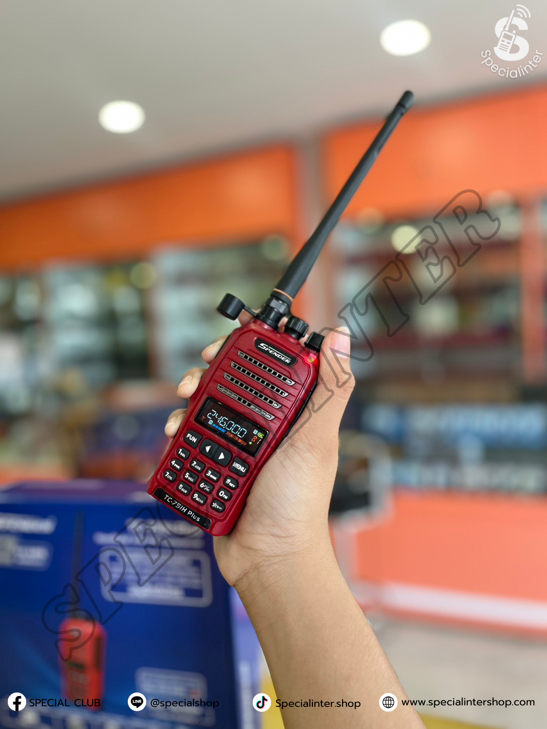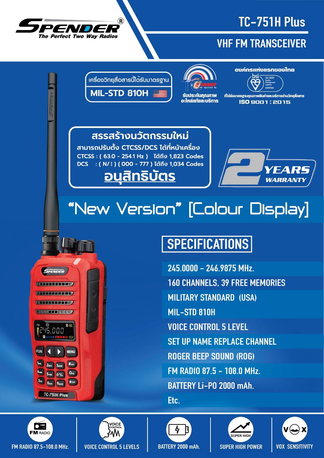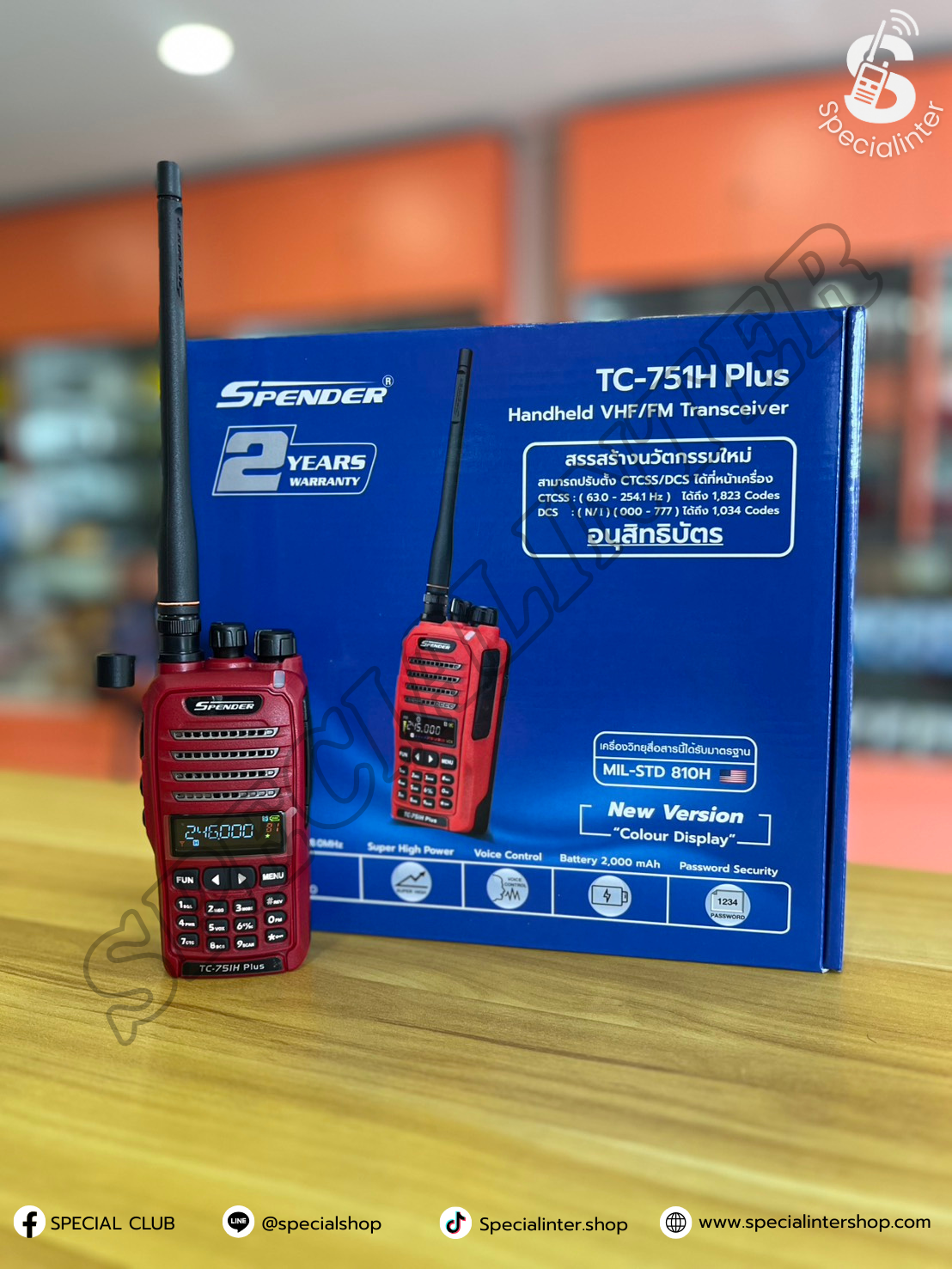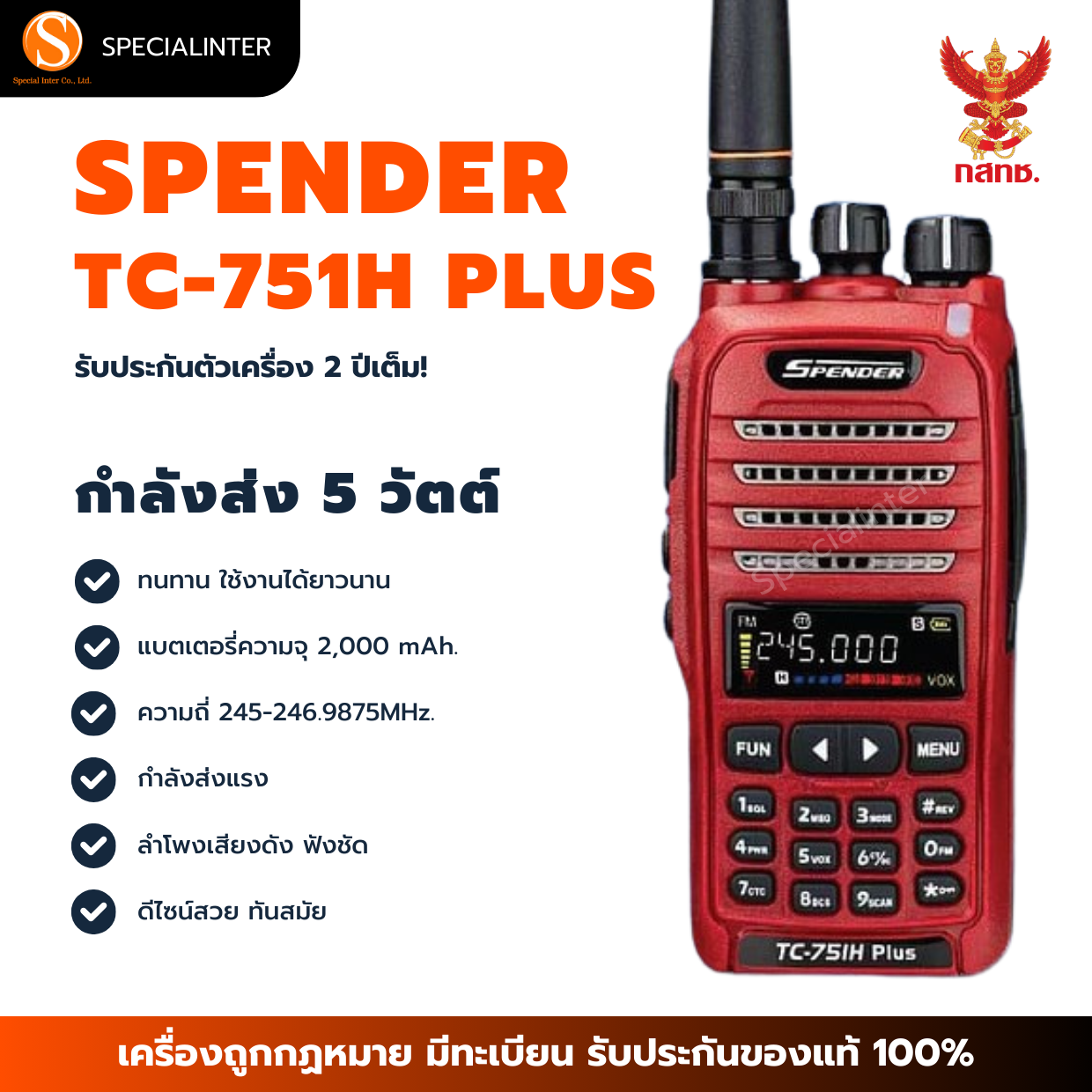วิทยุสื่อสาร SPENDER TC-751H PLUS เป็นวิทยุสื่อสารกำลังส่ง5วัตต์ประชาชนทั่วไปใช้ได้ย่านความถี่245 มี160ช่องการใช้งานเครื่องมีทะเบียนถูกกฏหมายผ่านหน่วยงานกสทช.โดยตรงเหมาะสำหรับงาน ก่อสร้าง รปภ. รักษาความปลอดภัย สนามกอฟ ตลาดนัด ลานจอดรถ งานอีเวนท์ เวทีการแสดง ถ่ายทำหนัง ร้านอาหาร ร้านหมูกระทะ ภาคสนาม เดินป่า ออกทิป ออฟโรด โกดังสินค้า และงานอื่นๆ 1 ชุดประกอบด้วย 1. ตัวเครื่องวิทยุ 1 เครื่อง **รับประกัน 2 ปี 2. แบตเตอรี่ 1ก้อน **รับประกัน 6 เดือน 3. เสาอากาศยาง 1 ต้น 4.เสาสไลด์ 1 ต้น 5. แท่นชาร์จ 1 แท่น **รับประกัน 6 เดือน 6. คลิปหลัง 1 ชิ้น 7.ที่ชาร์จไฟในรถ 8. คู่มือการใช้งาน 1 เล่ม 9.หูฟัง 1 เส้น