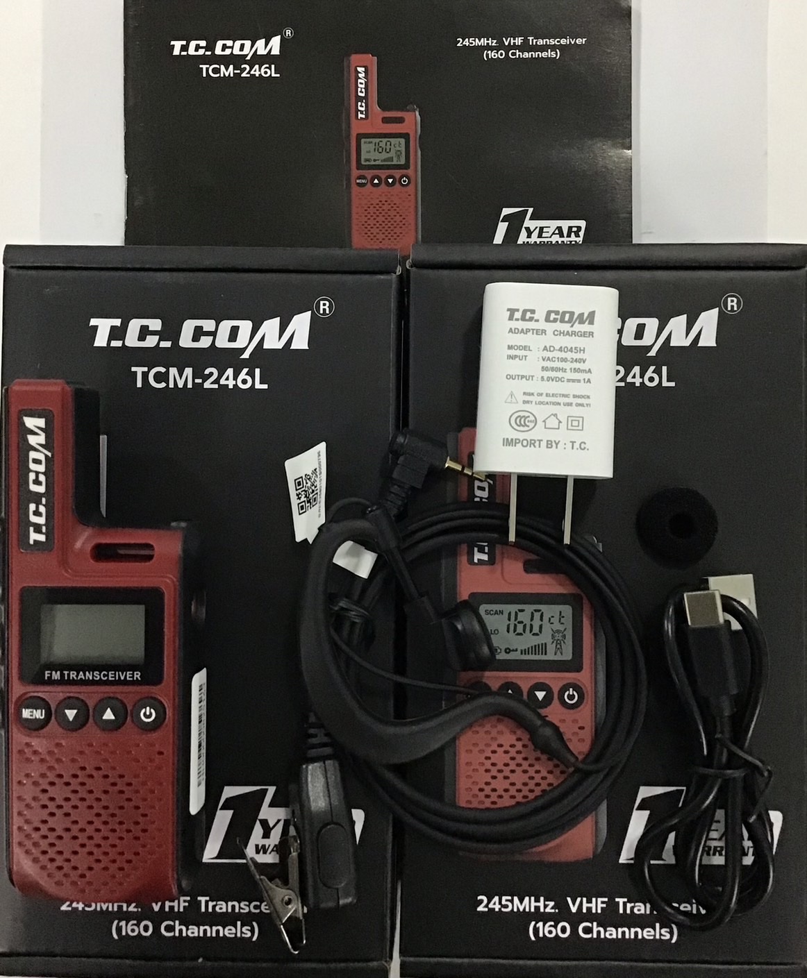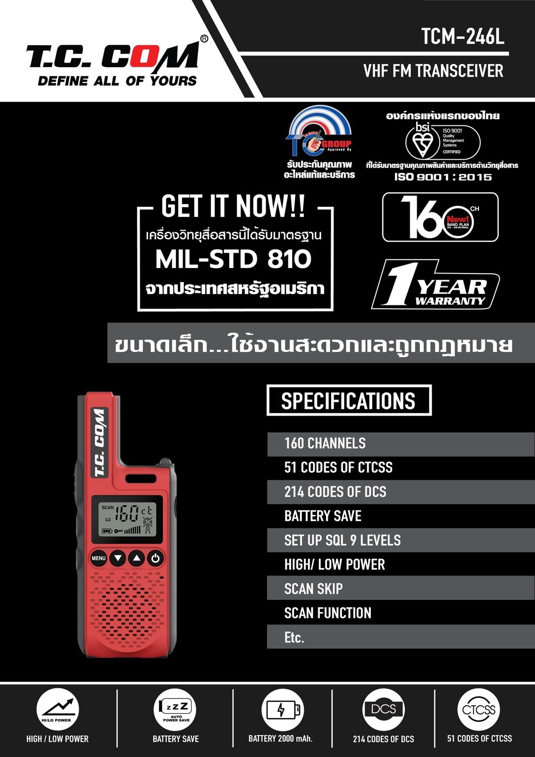 TCM-246L เป็นวิทยุสื่อสารกำลังส่งเพียง0.5วัตต์ โดยไม่ต้องขออนุญาต ที่ออกแบบดีไซน์ ให้มีขนาดเล็กกะทัดรัด น้ำหนักเบา ทนต่อการตกกระแทก ไม่ต้องขอใบอนุญาต ด้วยแบตเตอรี่มีความจุมากถึง 2,000mAh คุณสามารถใช้งานได้ตลอดวัน ตลอดช่วงการทำงานของคุณ