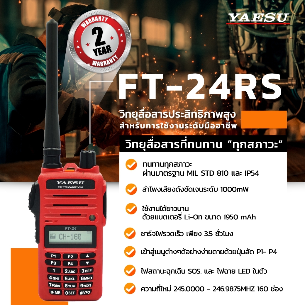 Yaesu FT-24RS เป็นวิทยุสื่อสารความถี่ภาคประชาชนที่ออกแบบมาเพื่อความทนทานและประสิทธิภาพในการสื่อสาร ด้วยมาตรฐานการกันน้ำและฝุ่นตาม IP54 และการรับรองจาก MIL-STD-810E ของกองทัพสหรัฐฯ เหมาะสำหรับการใช้งานทั้งในสภาพแวดล้อมภายในและภายนอกอาคาร