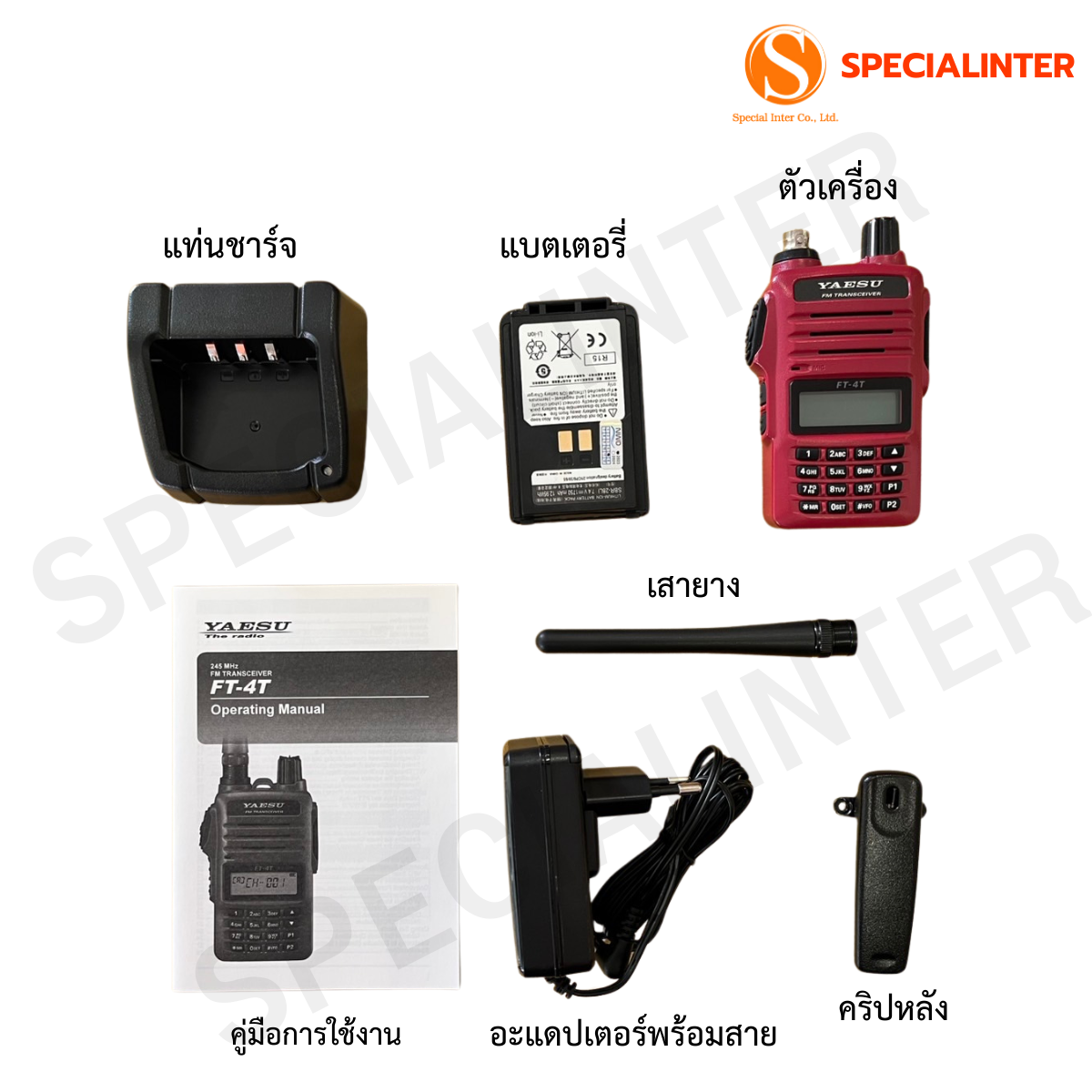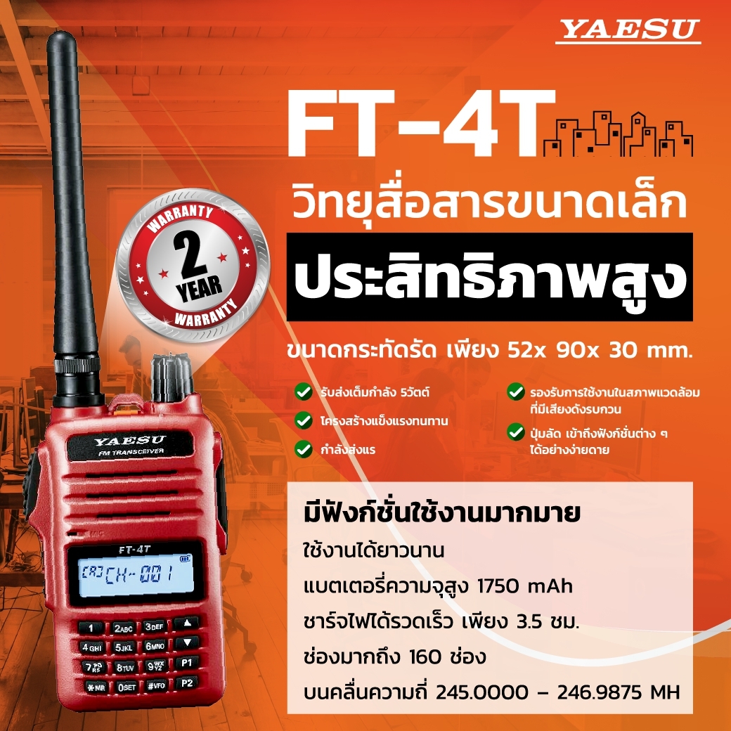 วิทยุสื่อสาร Yaesu FT-4Tวิทยุสื่อสารความถี่ประชาชน 245.0000 – 246.9875 MHz กำลังส่งสูงสุด 5 วัตต์เต็ม รับฟังวิทยุ FM ได้ ตัวเครื่องขนาดเล็กกะทัดรัด เทียบเท่านามบัตร ออกแบบปุ่มกดใช้งานง่าย เหมาะสำหรับกิจกรรมกลางแจ้ง งานอีเวนต์ หรือใช้งานทั่วไปYAESU FT-4T เป็นวิทยุสื่อสารขนาดเล็ก เสถียร และครบฟีเจอร์ เหมาะกับใช้งานทั่วไป, เทรลกิ้ง, หรือใช้เป็นวิทยุฉุกเฉิน พกง่าย ใช้ได้ยาวนาน ตัวเครื่องเบา ทนทาน และราคาสมเหตุสมผล