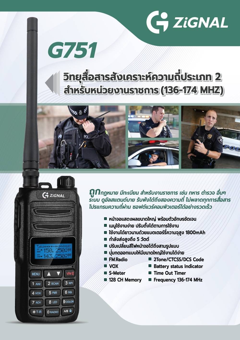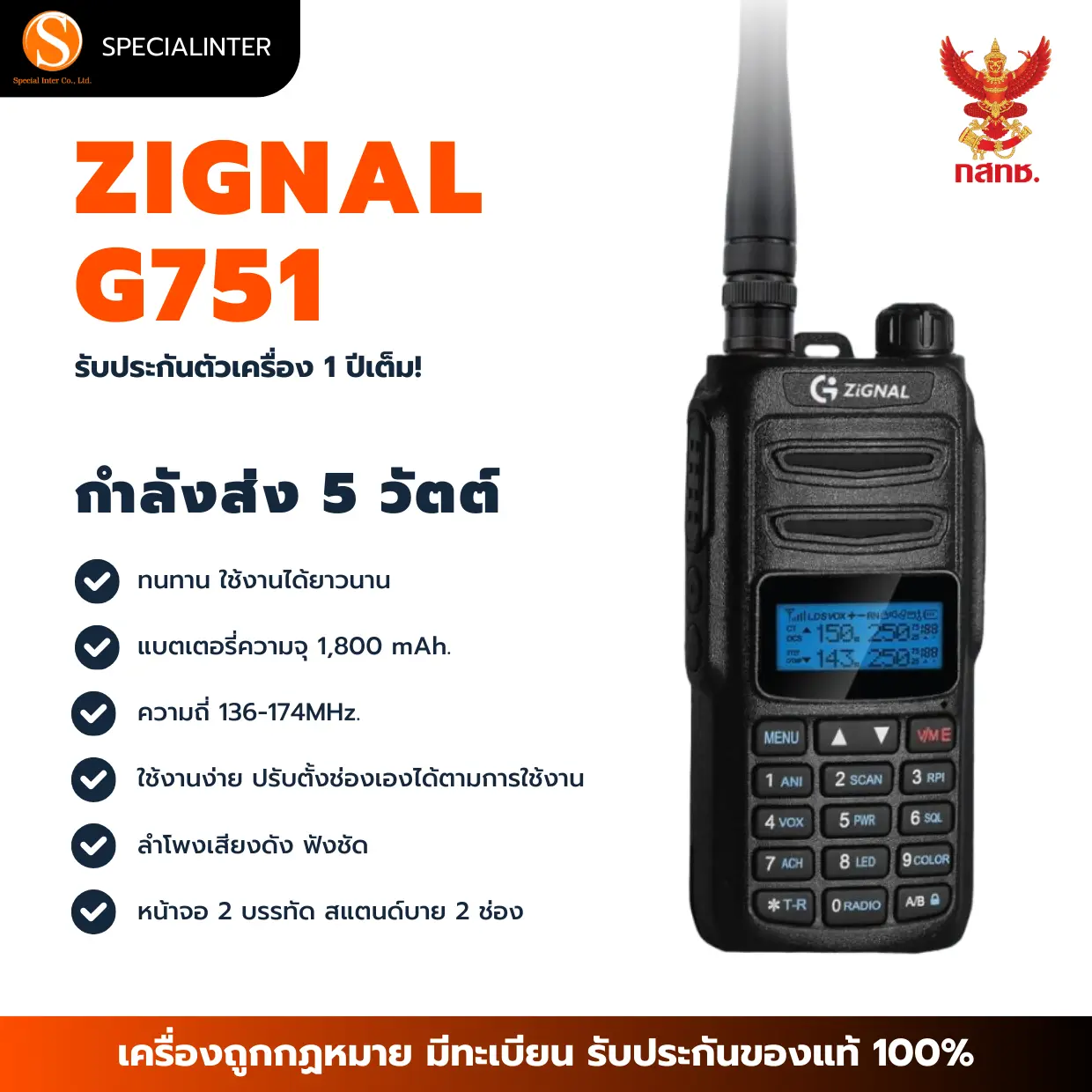 วิทยุสื่อสาร ZIGNAL G-751 ใช้ย่านความถี่ VHF 136–174 MHz ถูกต้องตามกฎหมาย มีกำลังส่งสูงสุด 5 วัตต์ ช่วยให้รับส่งสัญญาณได้ไกลและคมชัด ตัวเครื่องรองรับการสแตนด์บาย 2 ช่องพร้อมกัน ทำให้สามารถติดตามได้ทั้งสองความถี่ในเวลาเดียว แบตเตอรี่ Li-ion ความจุ 1,800 mAh ใช้งานได้ยาวนานตลอดวันโดยไม่ต้องชาร์จบ่อย